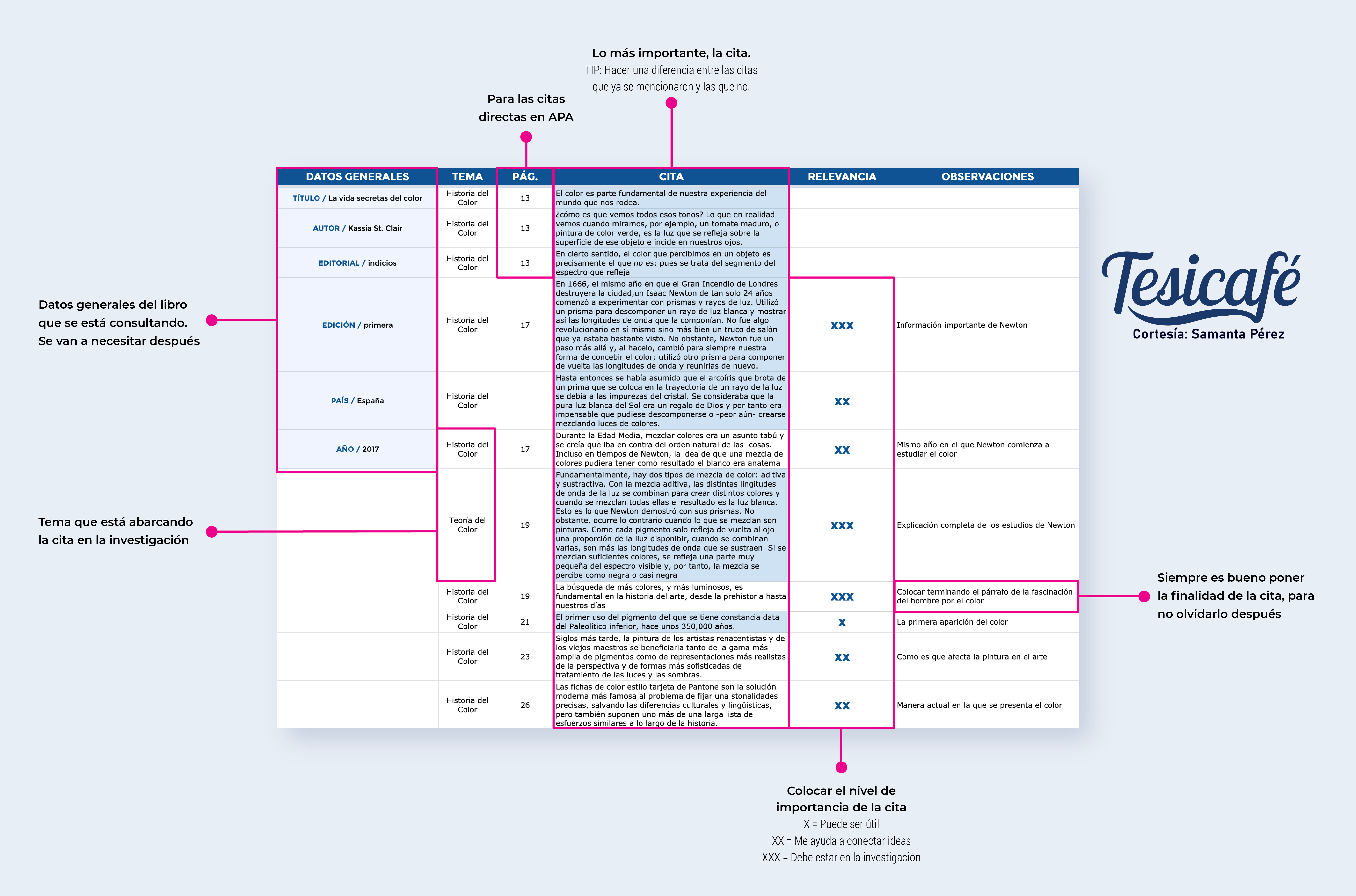 Además de colocar el tema, el nivel de relevancia, sus observaciones y la cita directa.